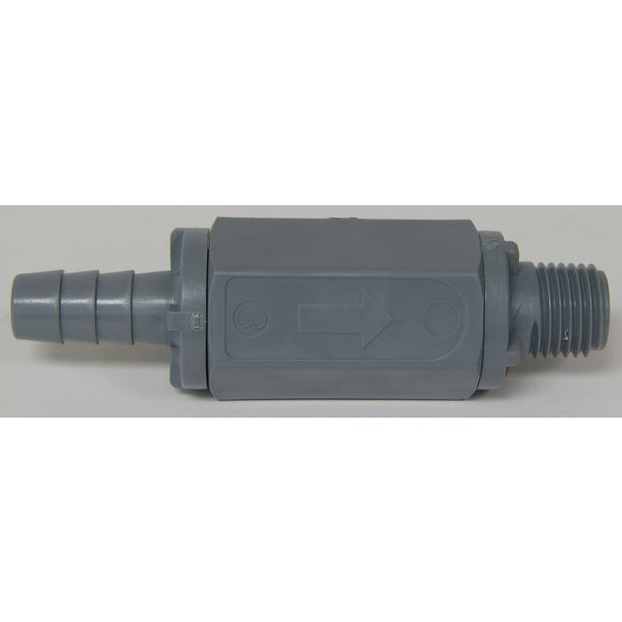 A check valve for flush manifolds by Hydro Systems. Fits FM-200, FM-500, and FM-800. Made with a 3/8-inch hose barb and a 1/4-inch MPT port.